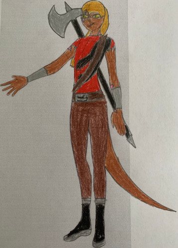 All Hunters are equipped with certain charms and amulets to assist them, Red specifically has her cape which was tailored not out of cloth but out of blood, more specifically creature blood, whatever creature she slays get its blood absorbed, others of that species cannot ever cut or tear through it, not even a dragon can burn through it. Plus there's her axe and magical eyes with second sight. I like the idea of her mind being a Bestiary, she has much knowledge of magic and myth but it holds no candle to Tor and the machine side of his brain which does contain an extensive Bestiary of every creature, magic spell, spirit, and "gods" that inhabit the world.