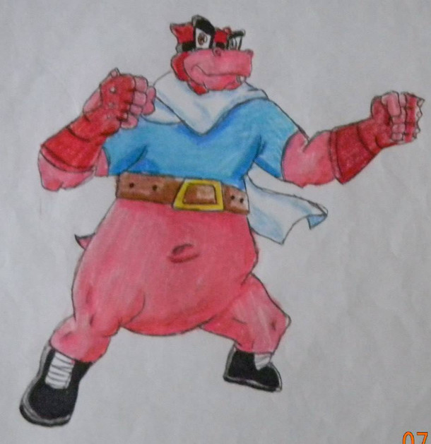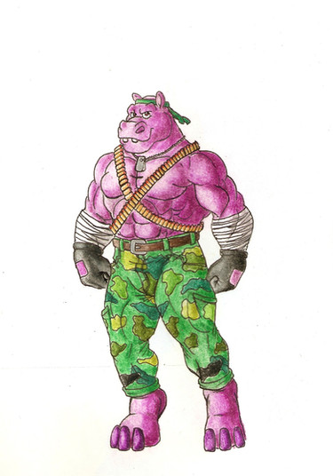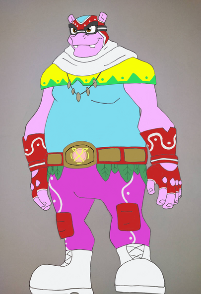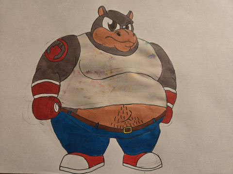 Backstory: Murray Riverre had a rough childhood with coming from the Riverre family or what the world would know them as, the Riverre Wrestlers. These globetrotting hippos would go from country to country to put on wrestling shows where the rings and arena would be destroyed all for the show. Things behind the scenes were another matter. The Riverre Hippos had a philosophy of "Strength is All That Matters" and you had to fight for your place in the family. Riverre youths were safe until they turned 5 and then they had to fend for themselves. When Murray turned this age, he had to fight to keep anything and even fight to get food at meals. Being the youngest in a family of Hippos meant that he was always gonna come up short in the strength department. This meant that young Murray would often end up bruised and hungry. An arena crew member eventually got a look at how Murray was treated and called the authorities. When the cops came to take Murray into protective custody, the Riverre's wouldn't let him go without a fight and ended up causing a riot with every cops needing to be brought in to fight the wrestlers. The cops barely won, the Riverres were all arrested, and Murray was sent to an orphanage as all his family was sentenced to 20 years minimum for causing a riot, assaulting officers, and destruction of public porperty (the Riverre's made a tower of cop cars destroyed cop cars).