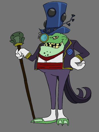 Since having Sly Cooper on the brain, I've been thinking about all kinds of ideas for how to reimagine the stories of the series and it's characters, usually I'd start with the Cooper Gang, but I just had so many redesign ideas for Raleigh that I needed to get it down.Backstory: Raleigh Froggerton VIII came from the once famous Froggerton family, which gained promenance during the Industrial Revolution by developing many mechanized factory devices. Generations later, the Froggerton family wasted all their wealth on bad business investments like Robot Pets and Humongo-Wrenches (used for giant bolts). With nothing left to their name, the family fell on hard times until Raleigh invented a pair of Magnet Boots that took the construction world by storm. With money now to their name, the Froggertons were quick to try and once again invest in terrible choices, but as the money was in Raleigh's control, he decided to reject their ideas. Seeing Raleigh as an obstacle, the Froggertons tried to bump him off, but Raleigh was too smart to fall for their trap and turned the tables on his family. Proving to be as sadistic as his nefarious family, Raleigh put them in chains and forced them to work in his factories as slave labor. When this was discovered, the police tried to arrest Raleigh and this led to an intense chase and escape. Now branded a criminal, something awoke in Raleigh and he wanted more of the crime life rather than the wealthy life. Remembering the story books from his youth that were filled with pirate adventures and treasue, Raleigh knew exactly what type of crime he should specialize in. Obtaining a ship and developing some high tech weapons for it, Raleigh gathered himself a crew and became a pirate captain who stole from many boats that came into his territory. This would go on for some time until a giant mechanized owl landed on Raleigh's main ship and proposed an alliance with him and a few other villains to form a unstoppable team of evil that could make all of their larger, sinister ambitions succeed together when it couldn't be done alone.