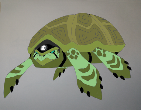 In this design I made him a little less humanoid and based him off of galapagos turtle which Terraspin's species' name is based on. In this version his shell opens up and inhales large amounts of air and exhales it through the stomach holes that still remain in this version. When using this power he can achieve short bursts of flight and continuous flight if he breathes constantly. If reverses the flow from stomach to shell he can create small tornadoes on top of him. If he inhales from both ends he can focus it into a concentrated superblast of breath from his mouth. He moves alot like the helicopters from Avatar. The holes underneath his flippers blast air too and also him to move from side to side fairly easily.