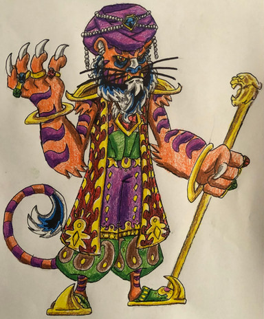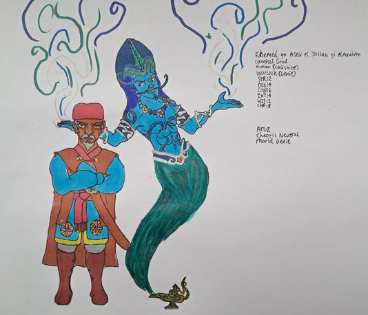 So in the center of the drawing is of course Wisher and on her left is her genie, the Djinn Rahgba who hails from the Citadel of Ice and Steel in the Realm of Air and to Wisher's right is the magical carpet, Vas (short for Vasnetsov), and her magical creature pet, Al the Al-Mi'raj (horned rabbits that send all wild beasts fleeing)