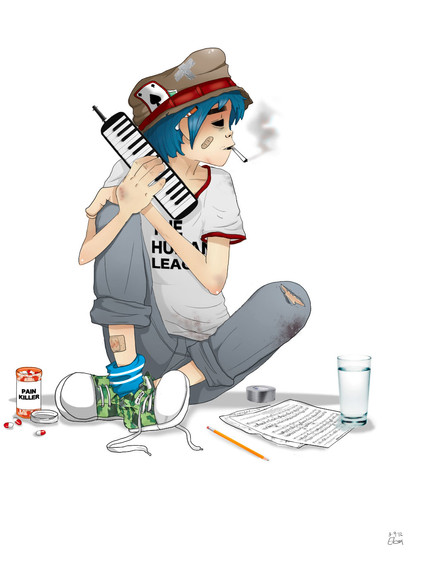 Anyway. 2D, hard at work on a song. How long has he been sitting there, plinking keys and writing out scribbly notes? He'll probably keep sitting there until he gets it just right-- or until he passes out on the floor. You know, whichever happens first.