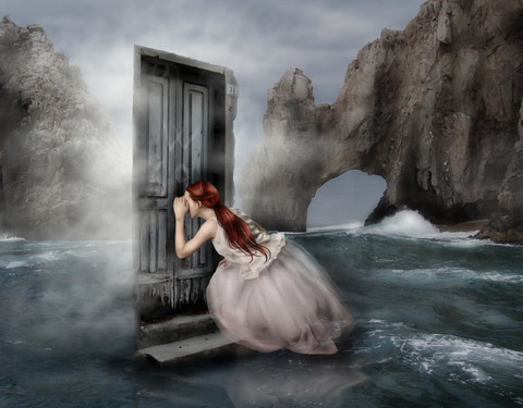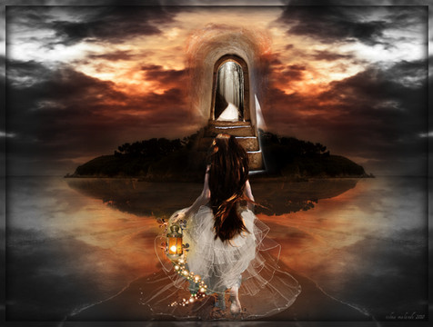 I love the dream-feel to this piece, and the monochrome palette works well. I like the vagueness of the mountains in the background, and the subtle patterns like wind-blown sand in front of the doors. And how the light seems to be coming from everywhere and nowhere, and she is almost glowing with it. Nice work!