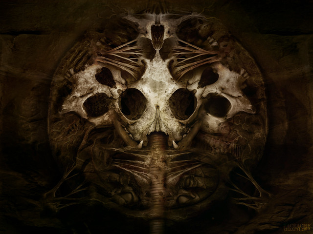 based around Dante's Inferno and the 9 levels of Hell.Old mesh of a backbone I had kicking around that I kinda like thrown into Bryce. after an hours Photoshop destruction I arrived at this.