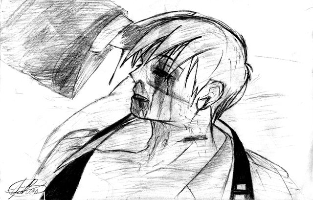 "W-what the heck's happening t'me?" he choked out before he was slammed to the floor. Once again he was lying in his own blood, this time looking up at the cruel face of the commanders as one sat on his chest, pinning him down, and the others grabbed his arms.