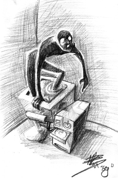 Heel fascinerend concept, mooi uitgewerkt. Beetje creepy maar vooral de poses vind ik goed, en hoe gedetailleerd het is (de banaan viel me trouwens pas op nadat ik het comment gelezen had).
