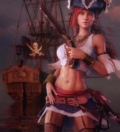 An interesting angle of view, and I like the ship and the shadows and light here. But the woman's skin looks plastic (even her shoes are more realistic than her skin!), her eyes are surely plastic, and her face is... well, dunno, like a barbie's face that was few times smashed by a hammer of a naughty child.