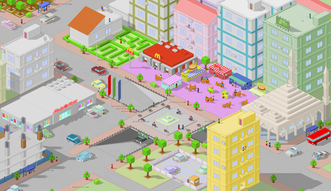 I especailly like how you haven't left anything boring, you have stuff everywhere. For example the truck at the back, the painters on the side, the golden man walking, the clown on stilts, the forklift etc. I especailly like the three signs on the side of the building, very well done indeed.
