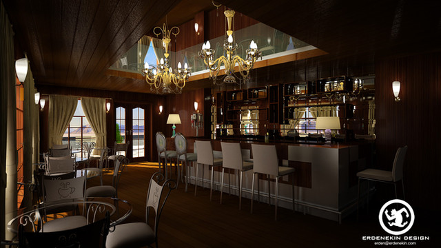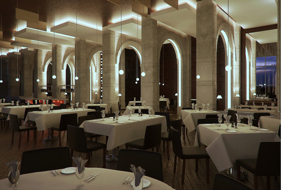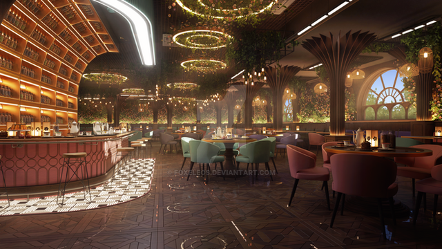 This is a very nice restaurant rendering . All of the colors chosen are very fresh and play nicely together, including the suade furniture and light fixtures. Thank you for posting this.