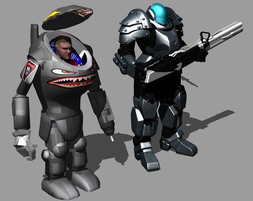 # Wow! The movements in this animation look great! It's really fluid and the timing is just right. I think it's funny how the blue guy taps the giant robot and then quickly readies his gun for action. XP
