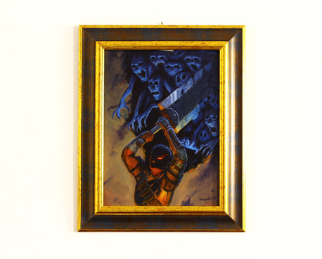 You are right not to be satisfied. The Emotion and Guts of the piece are there, however the small details need to be sharpened such as the shotgun/pistol? and the background demons. Pay close attention to the things you don't think are important. Devil is in the details, so Rip and Tear.