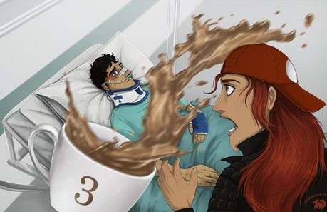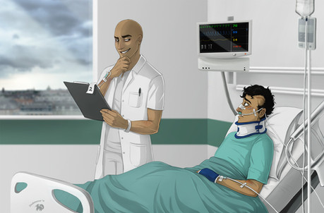 I love this so much - seeing an accurate portrayal of medical information in the HARPG world. Just reading that his ICP was realistically elevated after brain trauma, then his EVD (I'm assuming the drain was a ventric) was removed, the crani incision, seeing the monitors with healthy vital signs and that ever-too-realistic-looking Miami J collar. Even the IV bag. It's amazing how much it looks so real. Your medical background comes into play so eloquently here (even if I cringe for poor Connor... ahem Gideon now?).