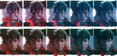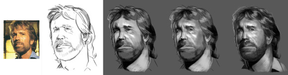 Here's the steps I took while painting the 50s Punk picture. Rather than starting off with a tight piece of line art (which is how I normally work) I tried to build up forms almost entirely with tone. As hard as it is to do when you're starting with blobs of paint you have to trust yourself at each stage even when there isn't much to look at. Having the Undo button and Layers in Photoshop makes that even easier.Pencil drawing usually focuses on adding shadows to a white page. In comparison, painting is usually about starting dark and adding light to a piece, getting more focused and detailed as you go. It's like pulling specifics out of murkiness.