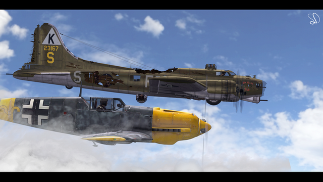 It even showed where the pilots were supposed to aim. My only complain is that Me-109's propeller still looks like working - It shouldn't be like this. Also, how did the pilot lose his wing?