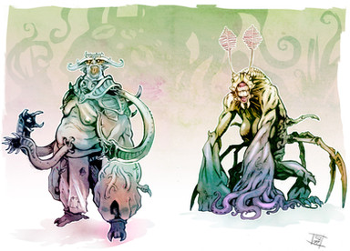 The rightmost monster guys look awesome. My advice would be to try and get rid of most of the lines in these paintings. The wizard looks notably less worked on than the rest of these characters, I'm not sure if that was intentional but it does seem like a lot more effort was put on the monsters and skeletons, which are frankly very, very good. Also, for the swords, try to make up your own textures with the brushes. It's more work, yes, but it looks a lot less 'artificial', if that makes sense. Great work man, keep it up!