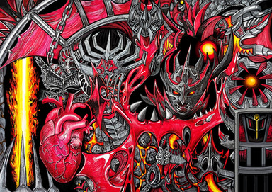 Drawn using fineliner and edited in Photoshop.Also used Illustrator to create the outer pattern.