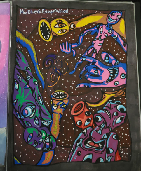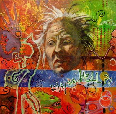 Talking with his self.Acrylic and Oil and text on raised panel