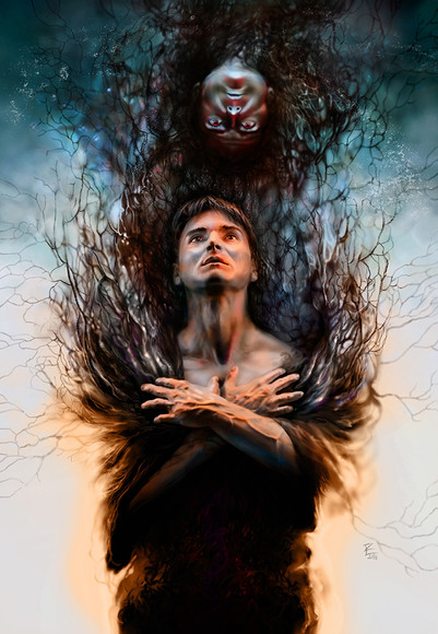 He waits. He expands beyond his realm, he is tangled.Oil on panel