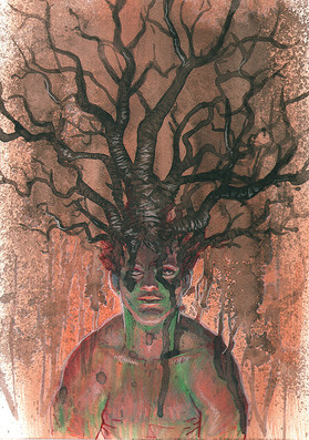This piece was sitting on the floor for a month or 2 (with the figure painted, and just green hues in the background, including square and a light sketch of tree shapes in the background. I finally finished it the day after I went to Horrorhound Indianapolis. Inspiration!